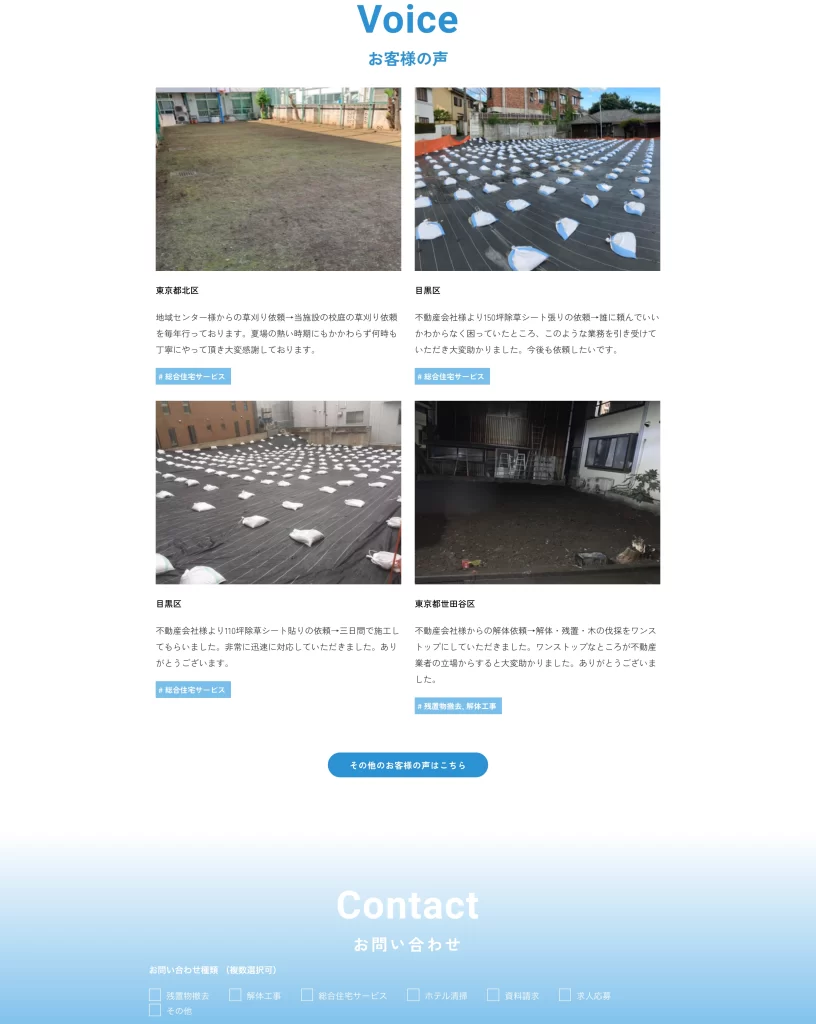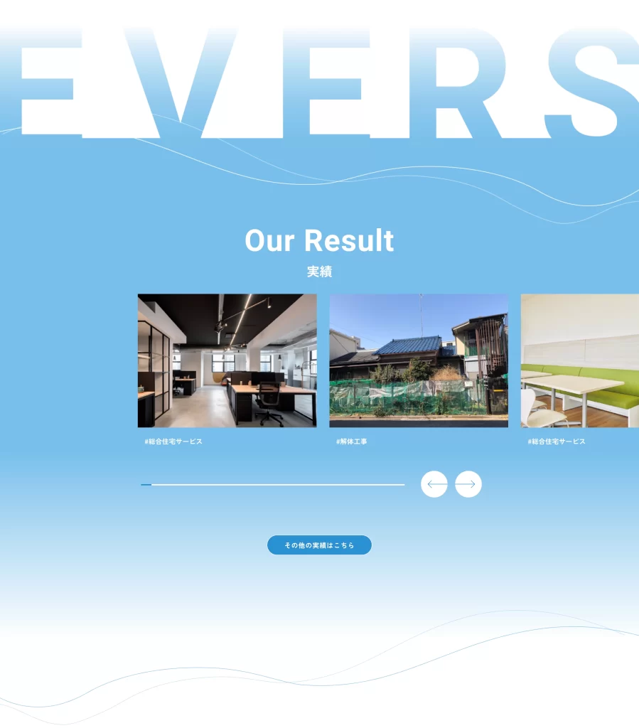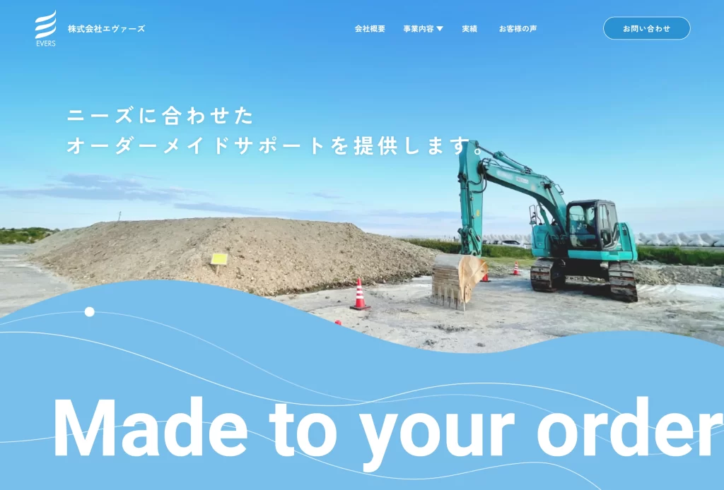 建物解体工事や残地物撤去、家具設置など、建物周りや空間作りに特化したトータルサポート会社「株式会社エヴァーズ」さまのコーポレートサイトを制作させていただきました。誠実かつ丁寧なサポートを提供するクライアントさまの雰囲気に合わせた、涼やかなサイト制作を目指しました。