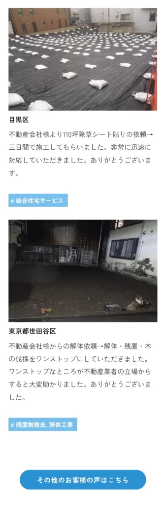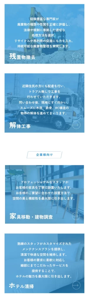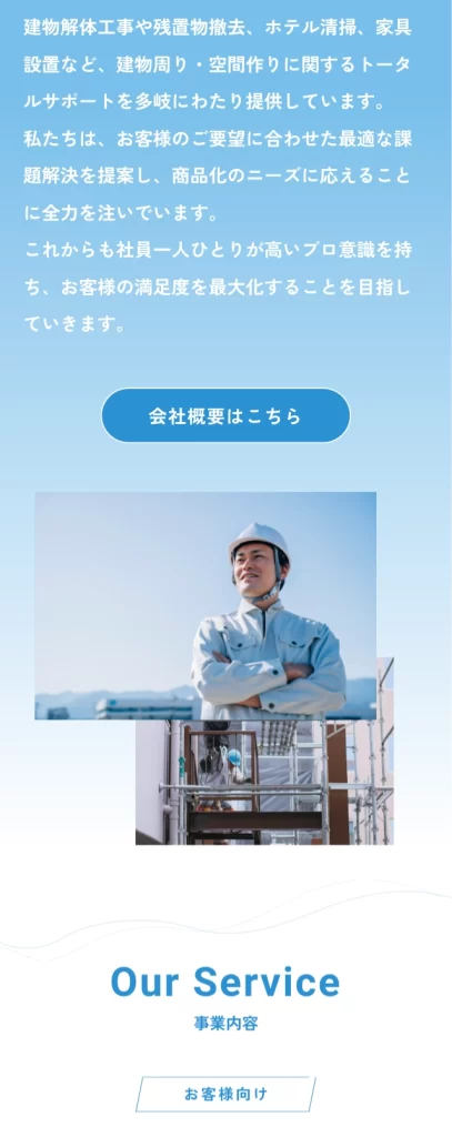 個人のお客様と企業の方 両方に対して事業を行なっているため、サイトを訪れた方が離脱しないよう導線をわかりやすくするよう設計しました。最低限のボタンを設置することで、複雑ではなく最短で欲しい情報が手に入るサイトを目指しました。
