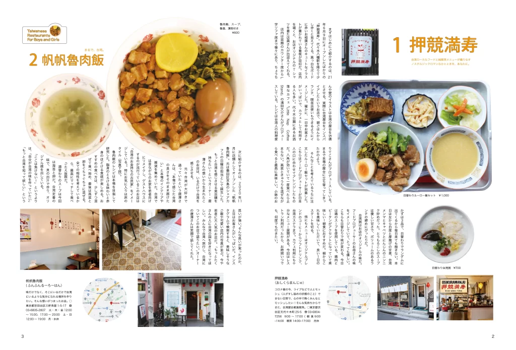 台湾料理特集では、お店の雰囲気もわかるように詳しく記載し、実際に行きやすい雰囲気作りを心がけました。